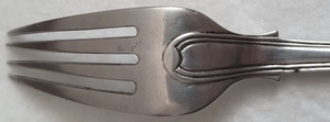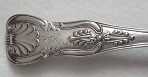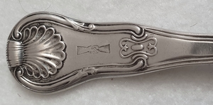 History and main variants of the "Kings" pattern The King’s pattern was introduced in the early 19th century and is the most popular among the Regency patterns. It was based on an 18th-century French design. The shape started out as the "Hourglass" pattern and then quickly developed into the much popular "Honeysuckle". Shell design to the anterior surface of handle terminal is concave, shell design to the posterior surface of handle terminal is convex. The heels are usually composed of a shell with two different motives at the junction with the stem: a curved line in the "union" variant or a rhomboidal device called "diamond". Usually, the pattern is struck on both sides of the flatware ("double struck"). The variant struck on the front only ("single struck"), is common in pieces made in Scotland.
